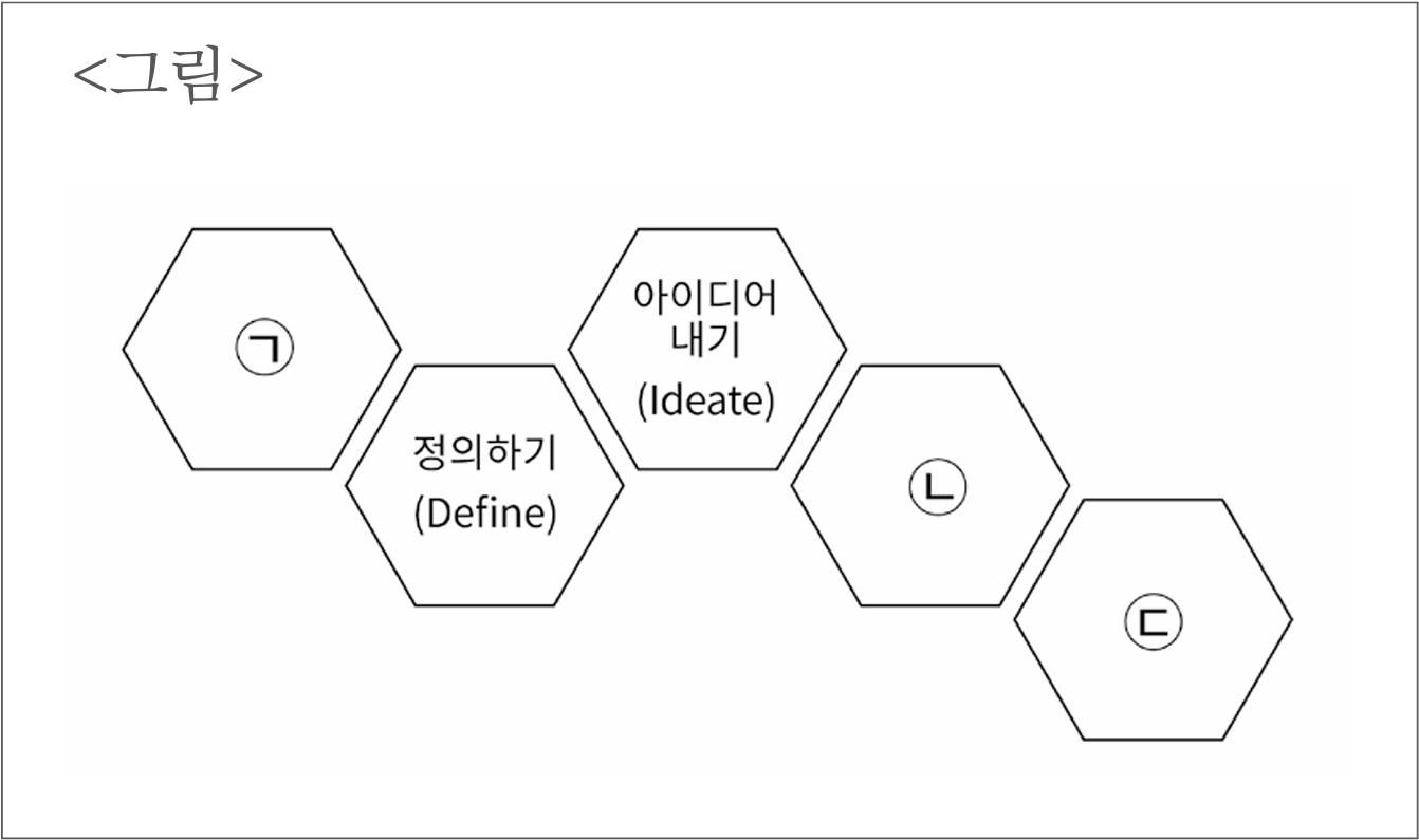 다음 <그림>은 스탠포드 대학의 D. School에서 개발한 디자인씽킹 프로세스이다. ㉠~㉢에 들어갈 알맞은 말을 옳게 짝 지은 것은?